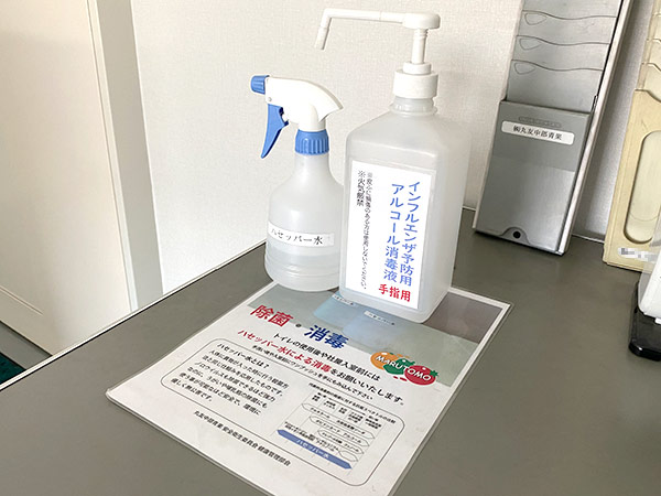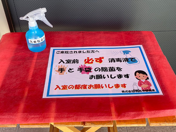 ・社屋および配送センター入り口に、ハセッパー水(次亜塩素酸水)を設置し、入室時の消毒を励行する。