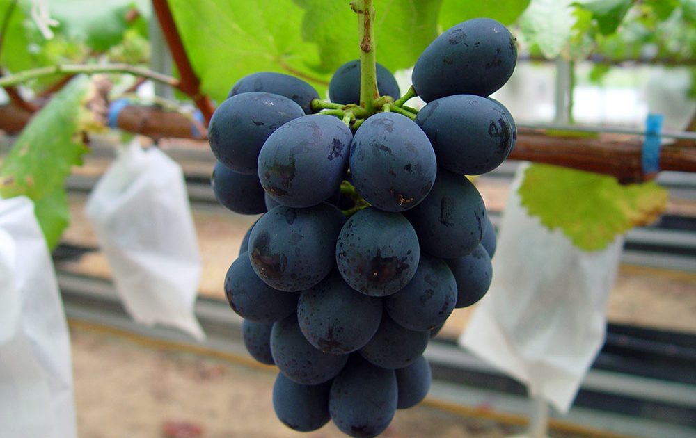 ナガノパープルは、巨峰とリザマートを交配して育成されたぶどうです。見た目は巨峰なので、『種無しで皮ごと食べられる巨峰』と考えていただければ、分かり易いかも知れません。