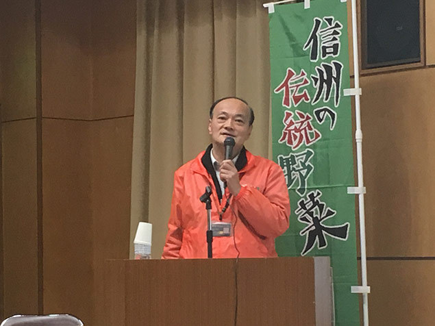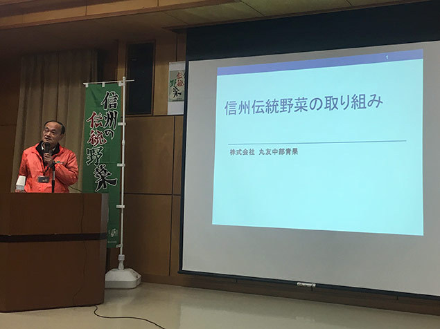 先日3月16日、長野市のながの市場福祉センターで行われた「平成28年度 信州の伝統野菜 産地情報交換会」で、事例・活動紹介として弊社長野支社長 宇野博文が登壇しました。